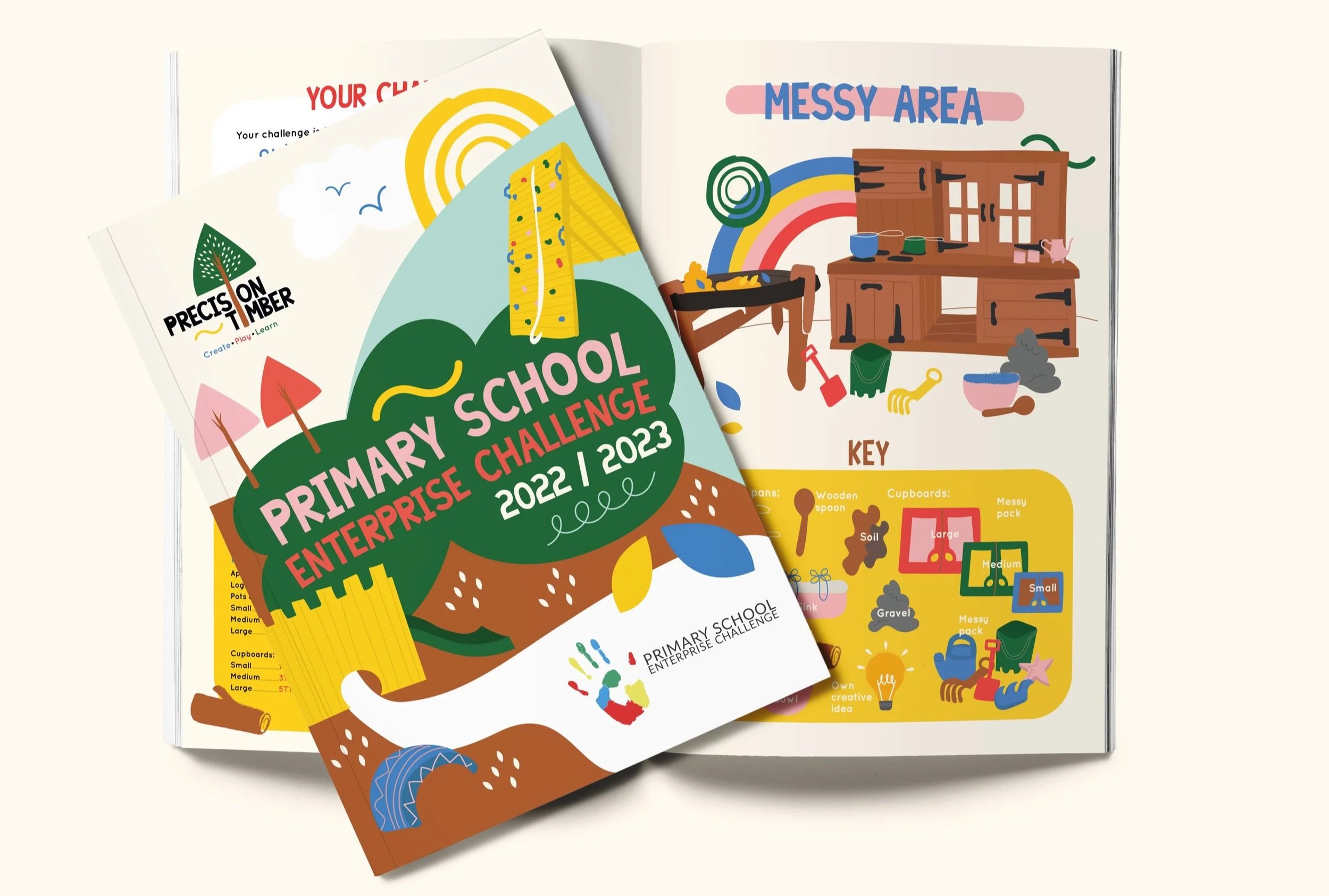 We were commissioned to design the learning resource and brochure used by pupils to guide them through the challenge, showcasing a range of creative ideas such as den building and messy areas.