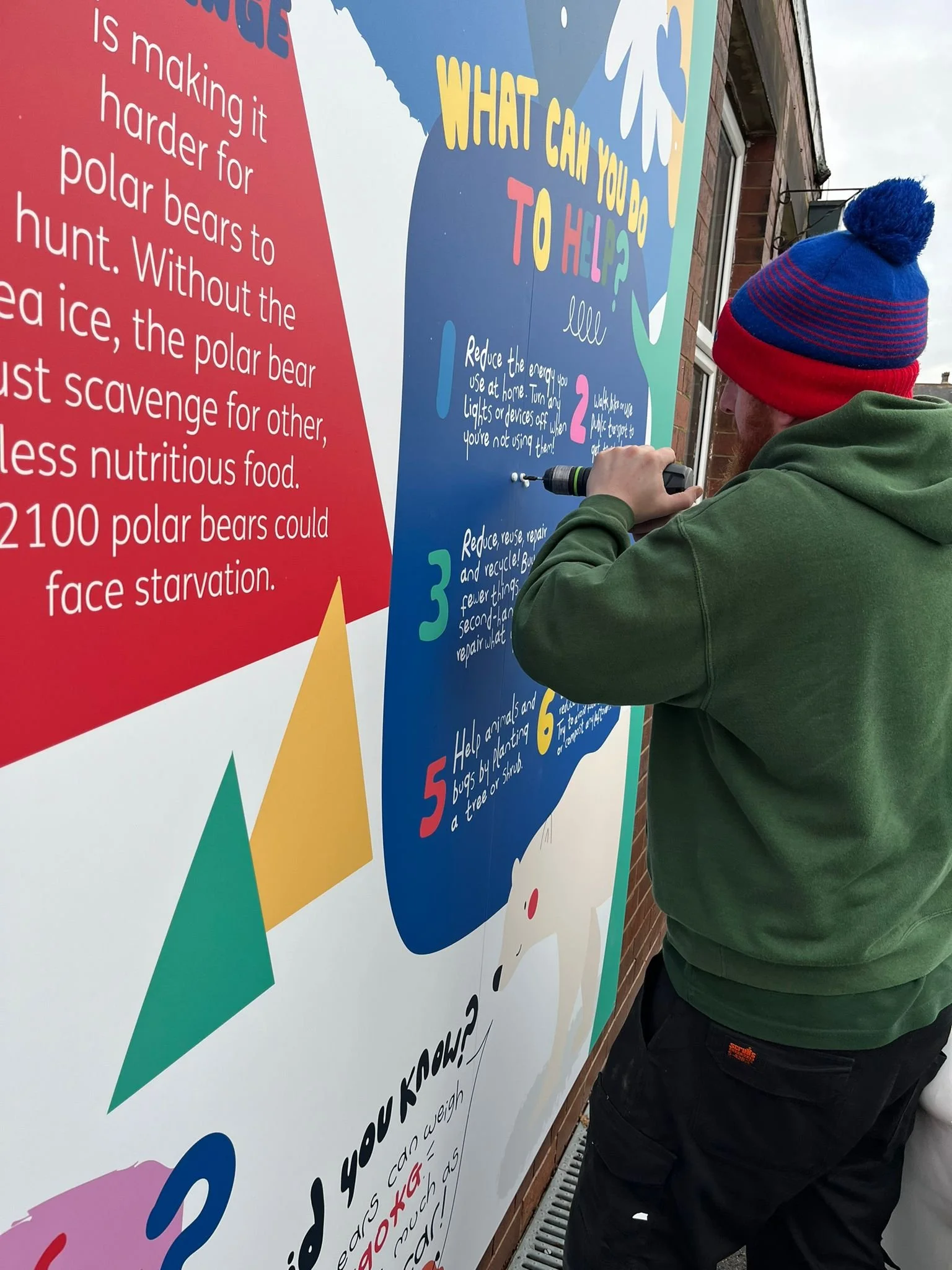 As a result of this, and to help the children at Southdale C of E School understand global warming and climate change topics, we were approached by the school to produce a wall mural to sit behind the ‘Polar’ sculpture.