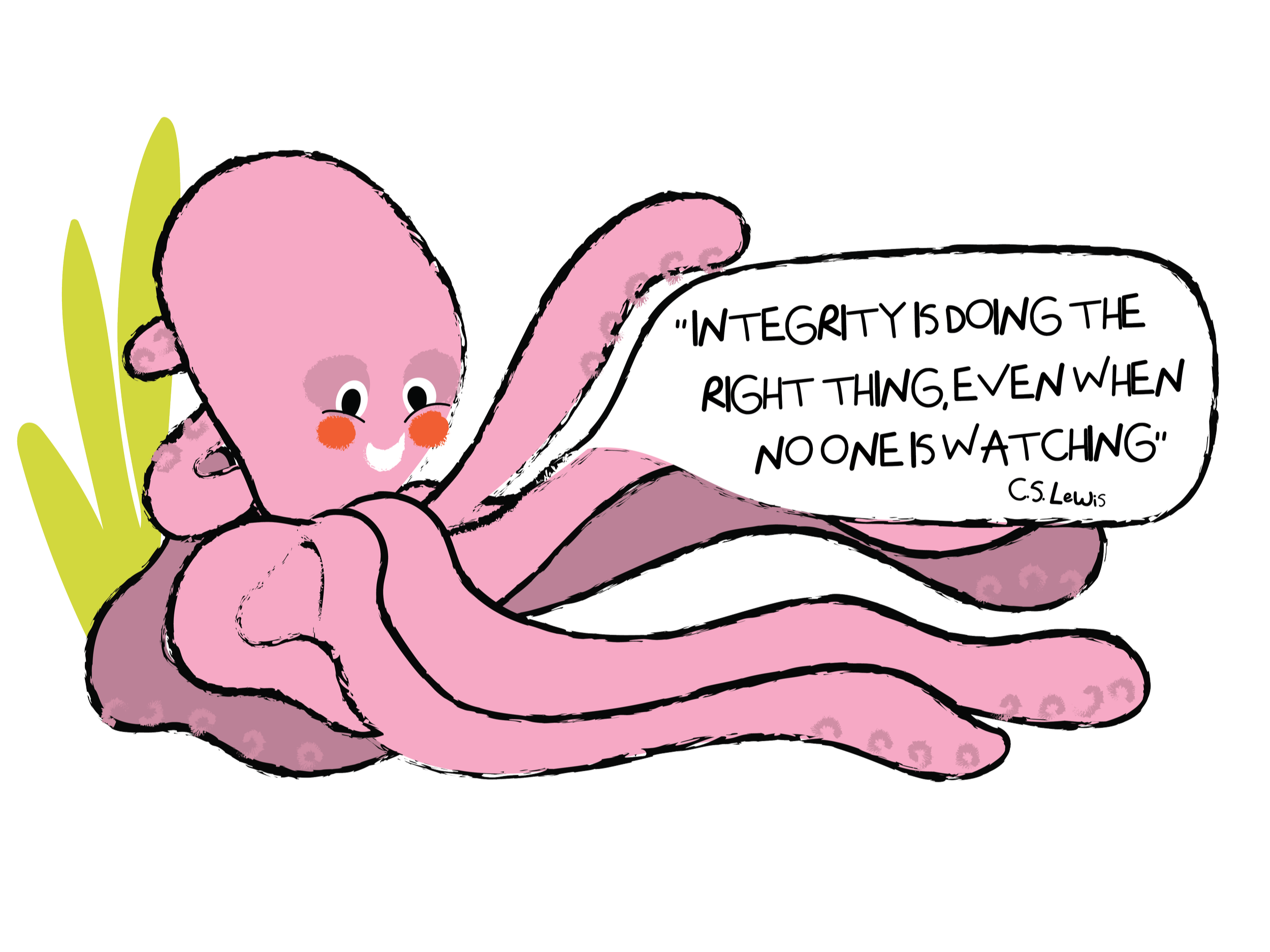 Storybook creatures drift beneath the ocean, with an octopus sharing a C.S. Lewis quote: “Integrity is doing the right thing, even when no one is watching.”