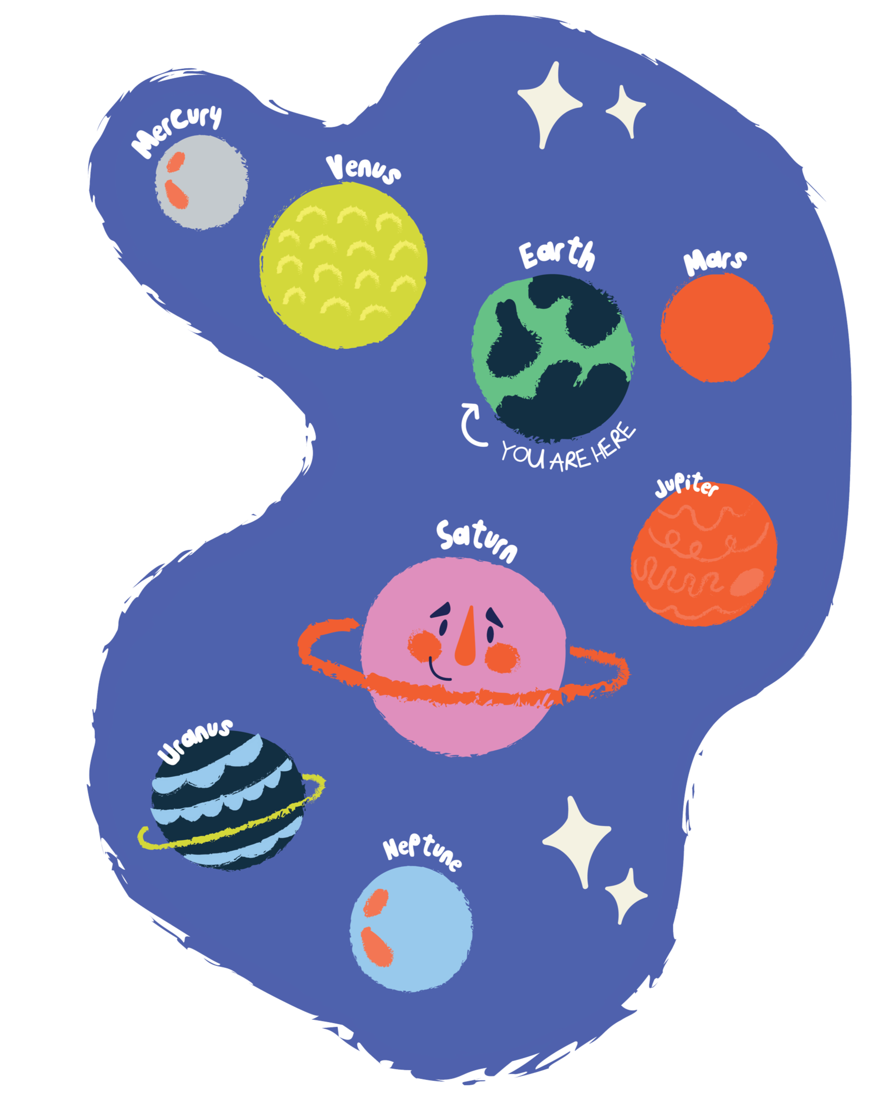 When designing for children, it’s important that learning is encouraged in a playful way. Alongside the illustrations, we included the names of the planets along with a fun fact, and a ‘Look & Find’. This section included hidden details and visual clues inviting children to explore the mural closely, turning the library walls into an interactive storytelling experience.